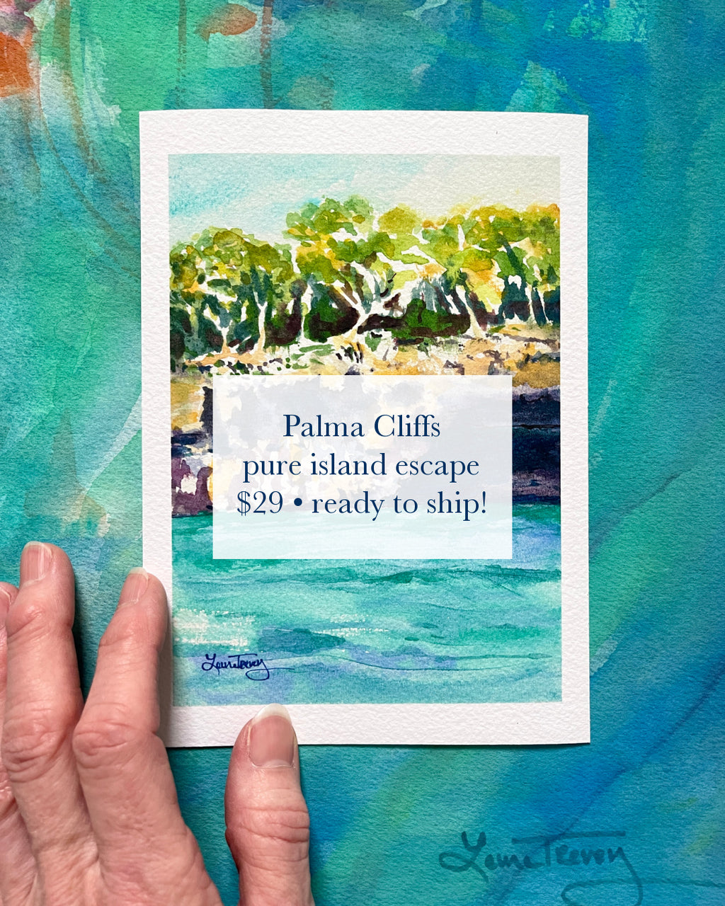 Transport yourself to the sun-drenched shores of Mallorca with this luminous giclée print of my original watercolor painting. This piece captures the breathtaking drama of rugged cliffs tumbling into the turquoise Mediterranean Sea, evoking the wild beauty of Palma de Mallorca's coastal landscapes - think golden light filtering through lush greenery, dramatic rock formations, and that endless, inviting blue water.