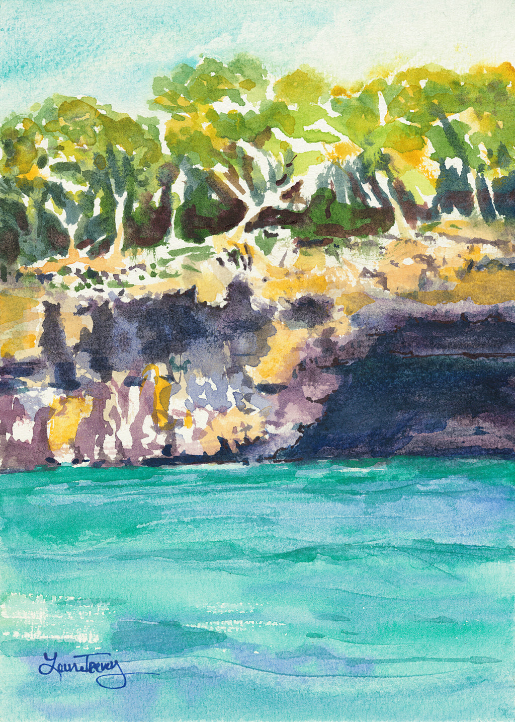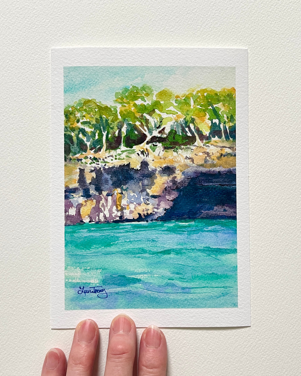 Transport yourself to the sun-drenched shores of Mallorca with this luminous giclée print of my original watercolor painting. This piece captures the breathtaking drama of rugged cliffs tumbling into the turquoise Mediterranean Sea, evoking the wild beauty of Palma de Mallorca's coastal landscapes - think golden light filtering through lush greenery, dramatic rock formations, and that endless, inviting blue water.
